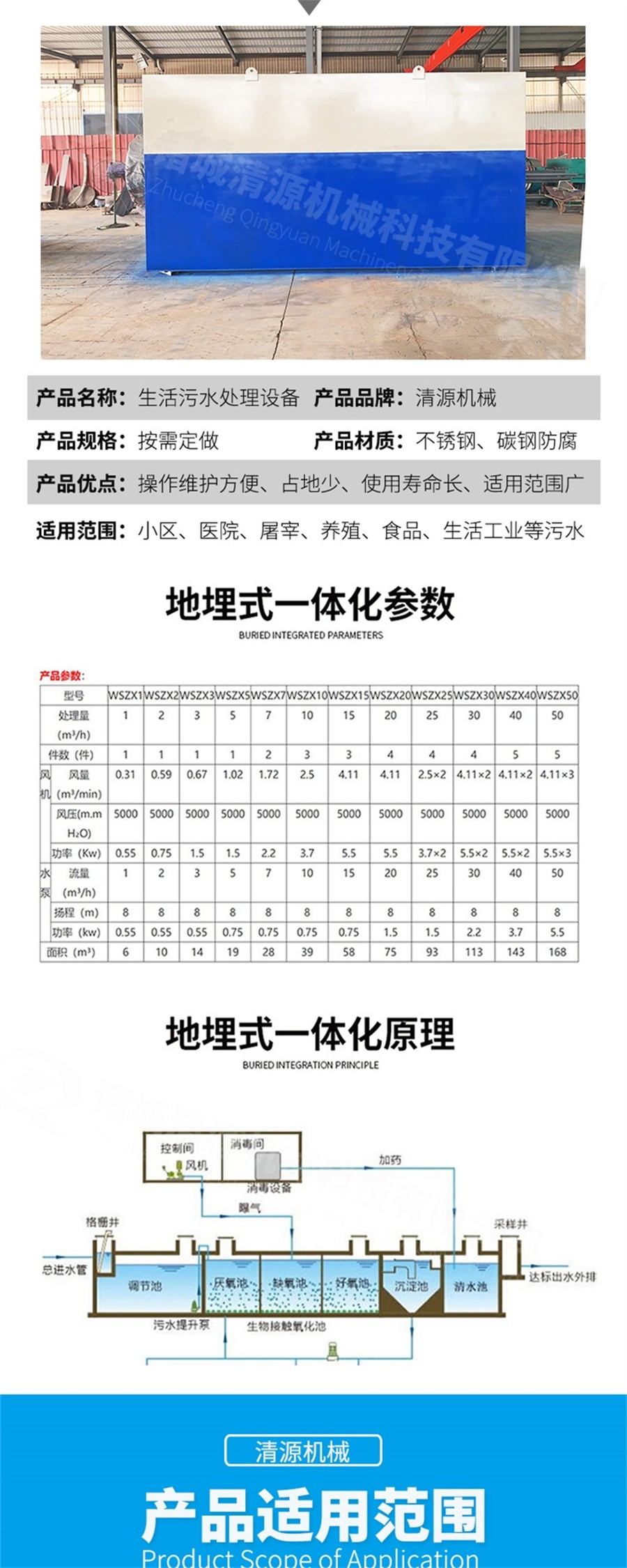 能夠處理生活系統綜合性廢水及其相類似的有機污水;采用玻璃鋼、不銹鋼結構,具有耐腐蝕、抗老化等優良特性,使用壽命長達 50 年以上 全套裝置施工簡單、操作容易,所有機械設備均為自動化控制,全部裝置可設置于地表以下,占地面積小。
